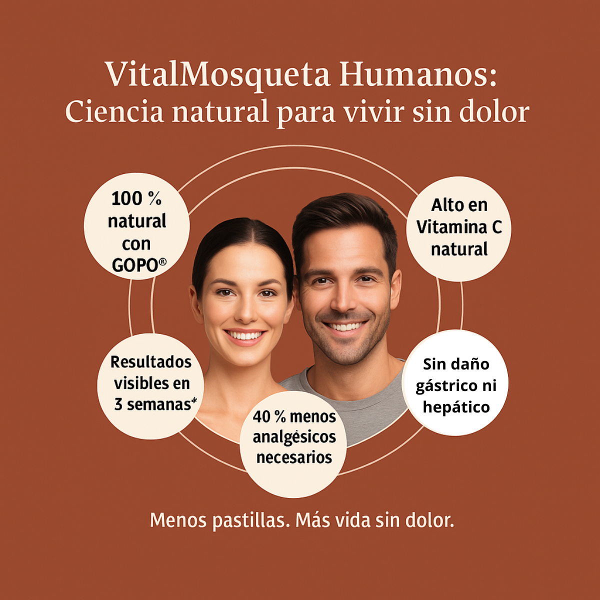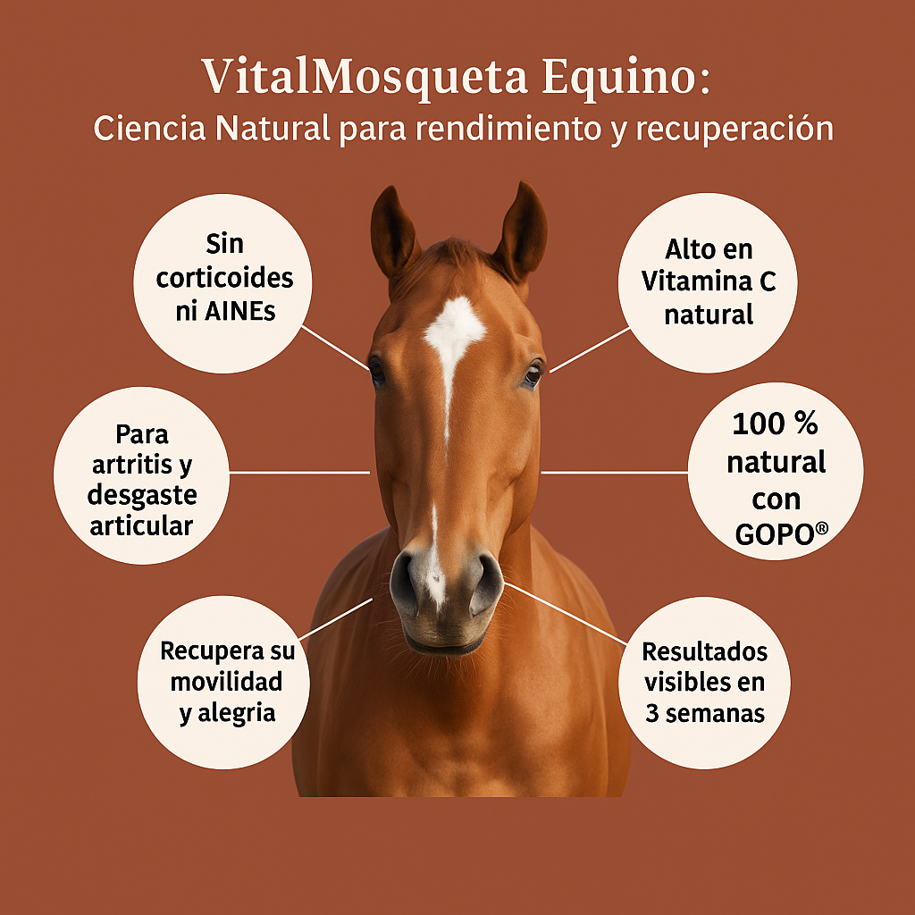 "En VitalMosqueta unimos ciencia y naturaleza para cuidar a quienes más amamos: personas, perros y caballos. Nuestros suplementos son 100% naturales, elaborados con rosa mosqueta chilena pura y el compuesto activo GOPO®, respaldado por más de 30 estudios clínicos. Ayudan a aliviar el dolor articular, reducir la inflamación y mejorar la movilidad de forma segura, sin efectos secundarios.